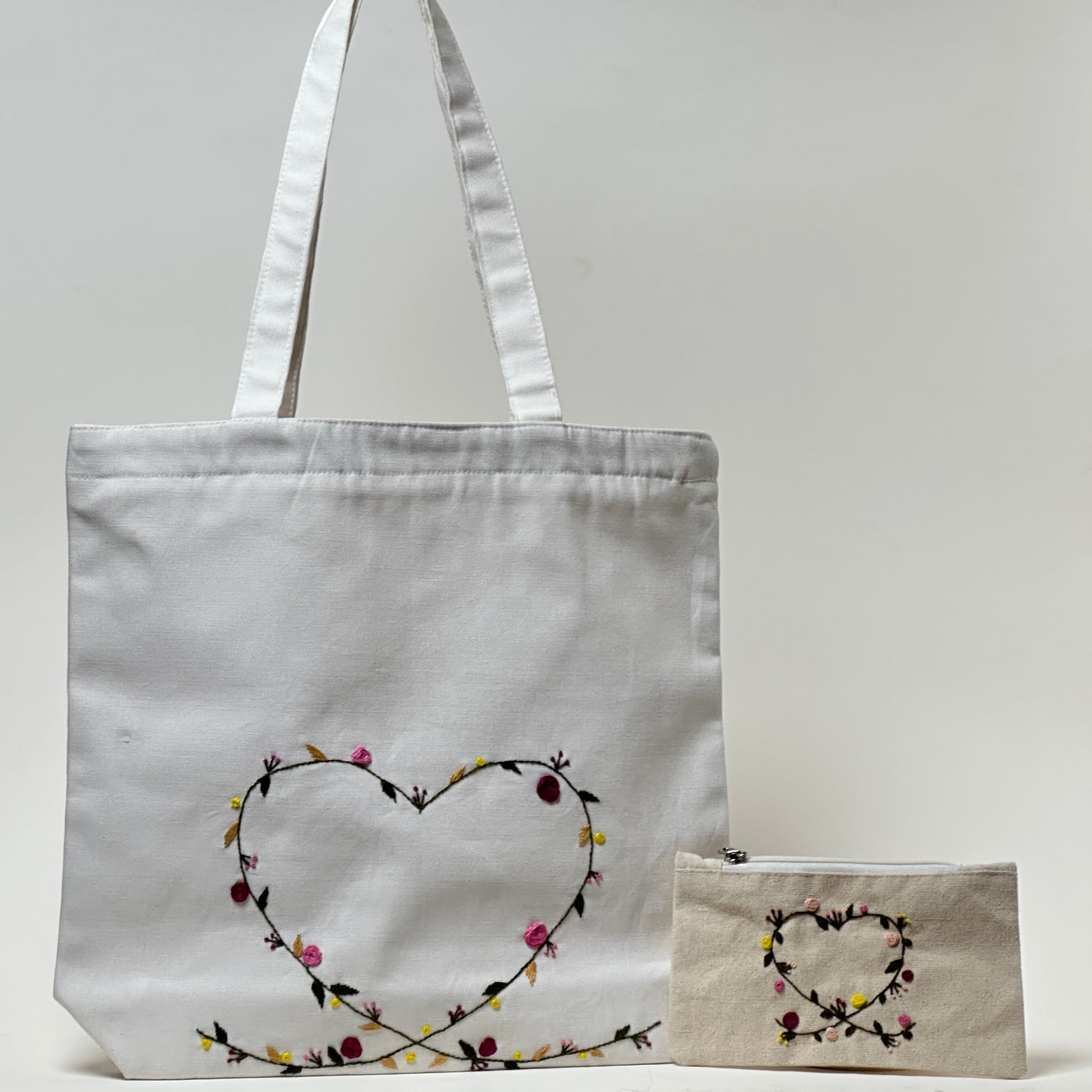 Elegant and pure, this white canvas tote is hand-embroidered by our skilled artisans with precision and care. The bright base brings every stitch to life, giving a fresh and timeless look. Each bag takes hours to craft and is released in limited numbers—your everyday essential, reimagined as wearable art.